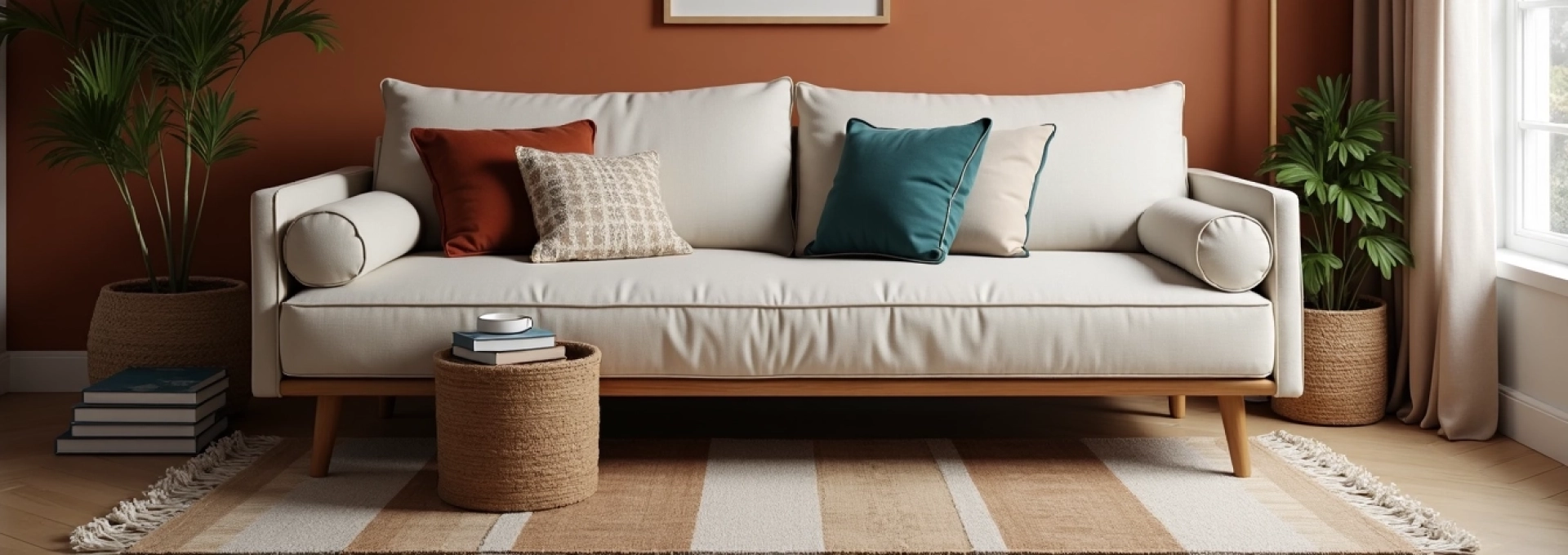 Pour intégrer harmonieusement votre canapé convertible, optez pour un revêtement qui s’inscrit dans cette palette. Un canapé en velours bleu paon deviendra instantanément le point focal de la pièce, tandis qu’un modèle en lin terracotta s’intégrera plus subtilement dans l’ensemble. N’hésitez pas à jouer avec les contrastes : un canapé dans des tons neutres peut être rehaussé par des coussins aux couleurs vives.